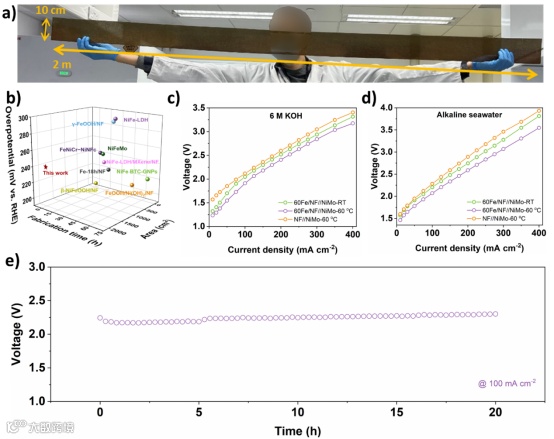 此外,我们将60Fe/NF从1 cm2放大到2000 cm2,证明了催化剂的一致性。我们还将Ni-Fe催化剂和商业多孔NiMo泡沫集成到碱性电解池( AEC )中,在6 M KOH和60℃ 碱性海水中表现出优异的耐久性,在2.3和2.9 V下的电流密度为200 mA cm–2。