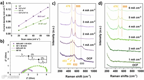 60Fe/NF电化学活性的提高的原因主要由三个:1)电化学活性面积提升;2)电荷转移电阻的降低,以及3)60Fe/NF从Ni-Fe氢氧化物 (Ni(Fe)OH2)到Ni-Fe羟基氧化物(Ni(Fe)OOH )的原位转化。