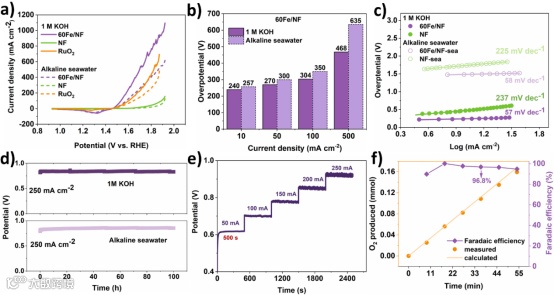 本文报道了一种高活性的Ni-Fe氢氧化物基OER催化剂,通过简单地将泡沫镍( NF )浸泡在Fe(NO3)3溶液中(将得到的产物命名为60Fe/NF),在1 M KOH溶液中,60Fe/NF的Tafel斜率为57 mV dec-1,在10、100和1000 mA cm-2的电流密度下,过电位分别为240、304和680 mV,表现出优异的OER性能。在1 M KOH电解液和碱性海水中,60Fe/ NF在250 mA cm-2的大电流密度下循环100 h,表现出优异的电化学耐久性,同时保持96.8 %左右的高法拉第效率。与NF相比,Fe的掺入可以显著增强OER性能。