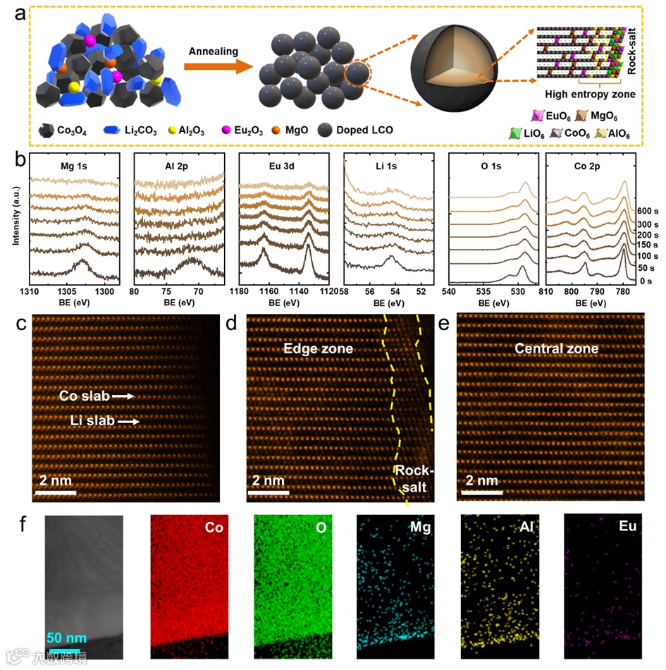 图2. LCO-MAE的形成及结构分析。(a) LCO-MAE的合成过程示意图。(b) LCO-MAE中Mg 1s、Al 2p、Eu 3d、Li 1s、O 1s和Co 2p的XPS深度分布图。(c) LCO, (d) LCO-MAE边缘区,(e) LCO-MAE中心区的HAADF-STEM图像。(f) LCO-MAE的EDS映射。