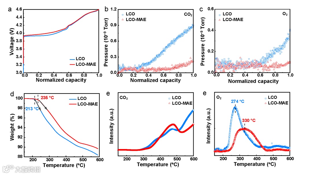 图4. 在充电和加热过程中的气体释放检测。(a) 原位DEMS测试时的充电曲线, (b) CO2和(b) O2释放。(d)满充状态下电极的热稳定性,(e)加热时CO2和(f) O2的释放。