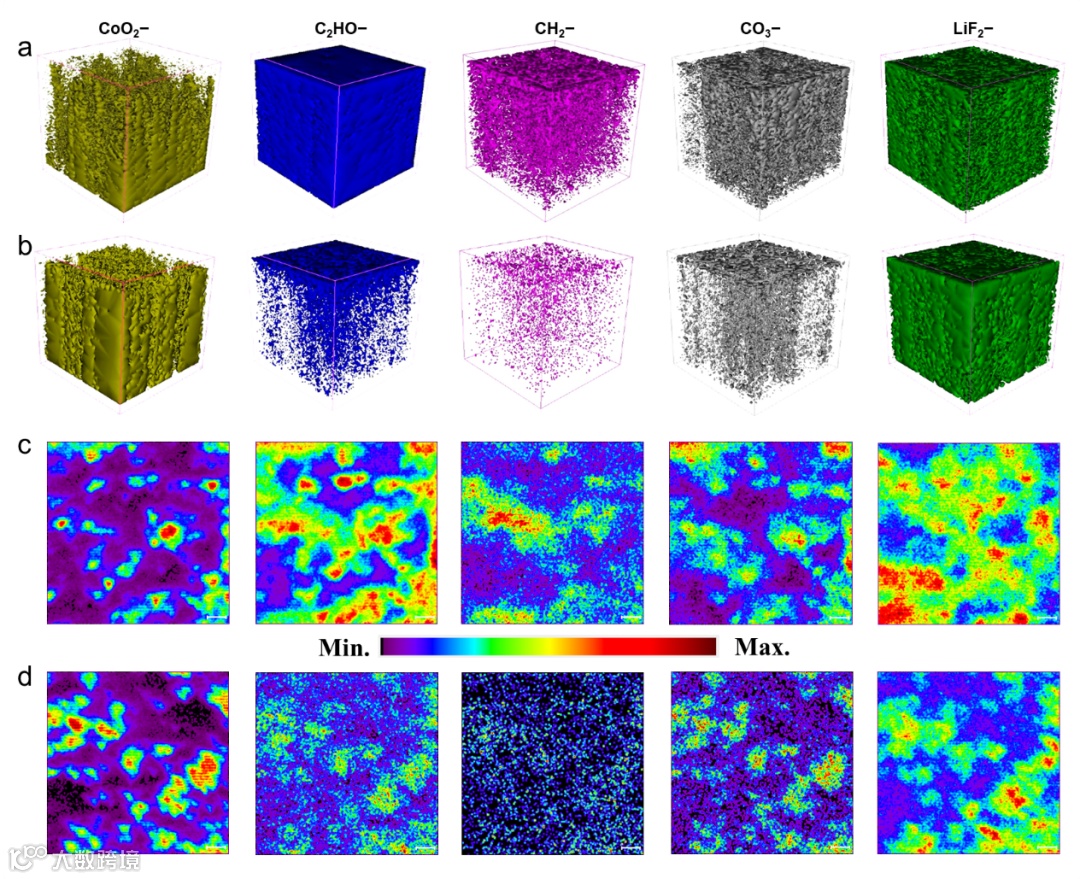图5. TOF-SIMS测试结果。(a) LCO和(b) LCO-MAE阴极表面经过100次循环后的CoO2−、C2HO−、CH2−、CO3−和LiF2−碎片的三维重建。(c) LCO和(d) LCO-MAE中相应的垂直TOF-SIMS信号片段的积分。