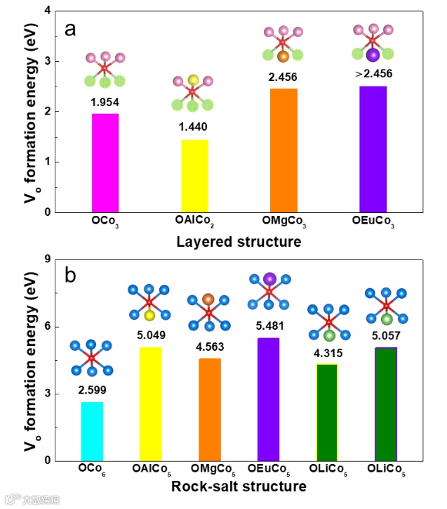 图8. 不同配位环境下氧空位(Vo)形成能。(a)完全锂化层状钴酸锂中的情形。OCo3对应未掺杂的LCO, OAlCO2、OMgCo3和OEuCo3对应掺杂的LCO。(b)岩盐CoO结构中的情形。OCo6对应未掺杂CoO, OAlCo5、OMgCo5、OEuCo5、OLiCo5(邻接Al)和OLiCo5(邻接Eu)对应掺杂CoO。发现由于Eu会移位并与氧保持完全配位,OEuCo3中无法形成氧空位,推测OEuCo3中氧空位形成能高于2.456 eV。