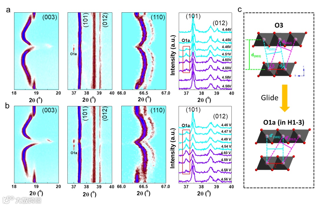 图7. LCO (a)和LCO-MAE (b)在初始充放电过程中的结构演变。为了说明O3和O1a (H1-3)相之间的关系,在右侧显示了XRD图谱高压下的叠加图。图解从O3到O1a (H1-3)相变过程中d(101)和d(012)的突变(c);d(101) = L*sin(α)、d(012) = L*sin(β),如果d(003)减小而没有发生滑翔,则sin(α)和sin(β)减小,因此d(101)和d(012)预计会略有减小;而在4.55 V左右,d(003)的减小伴随着d(101)的突然增大和d(012)的突然减小,说明Co-O层发生了滑移,相变由O3变为H1-3。