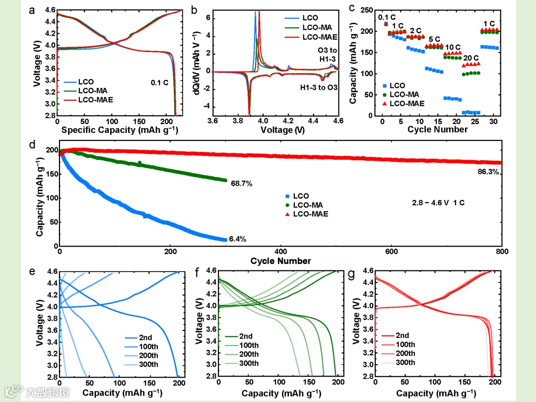 图3. LCO、LCO-MA和LCO-MAE的电化学性能。(a)充放电曲线和(b)相应的dQ/dV曲线对比。(c)倍率能力和(d)电池循环性能。(e) LCO、(f) LCO-MA和(g) LCO-MAE在1C下循环时的充放电曲线。