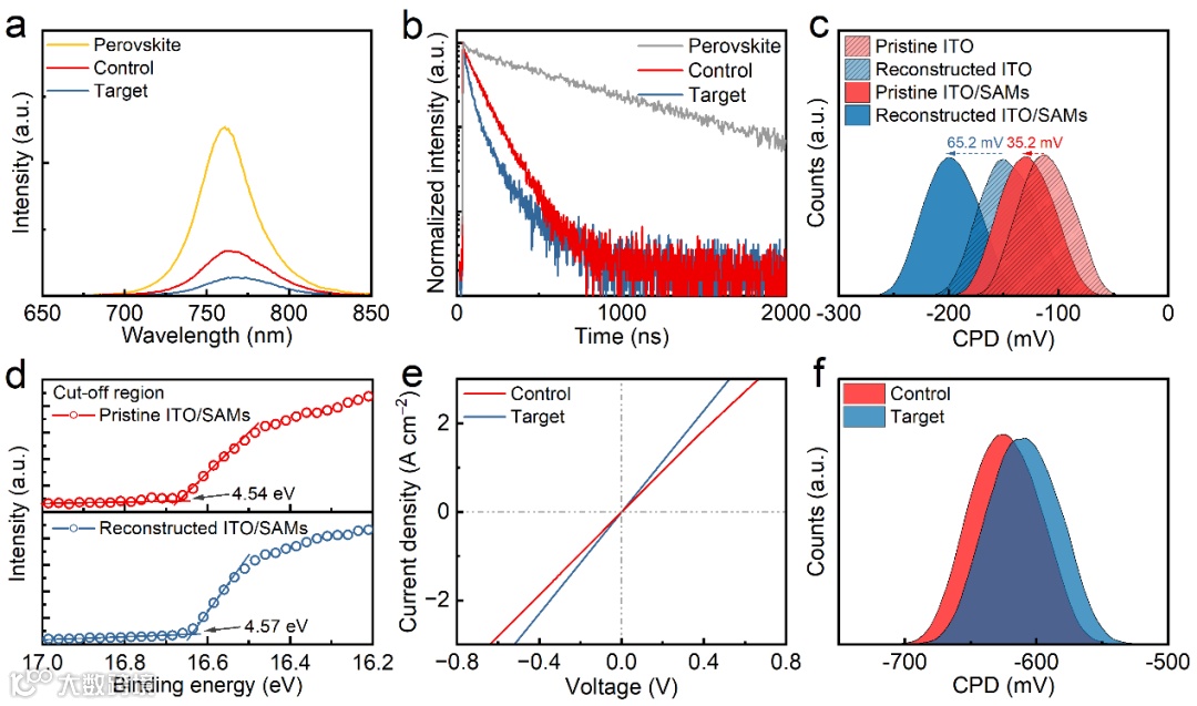 本工作还研究了ITO表面重构后对钙钛矿薄膜载流子动力学的影响。通过稳态PL和TRPL表征发现,重构后的ITO更有利于空穴载流子的提取,这归因于更多SAM在重构的ITO表面的均匀吸附。高密度SAM在重构ITO表面的吸附,还改善了SAM与钙钛矿薄膜之间的能级排列,使得空穴载流子更有效提取和收集。