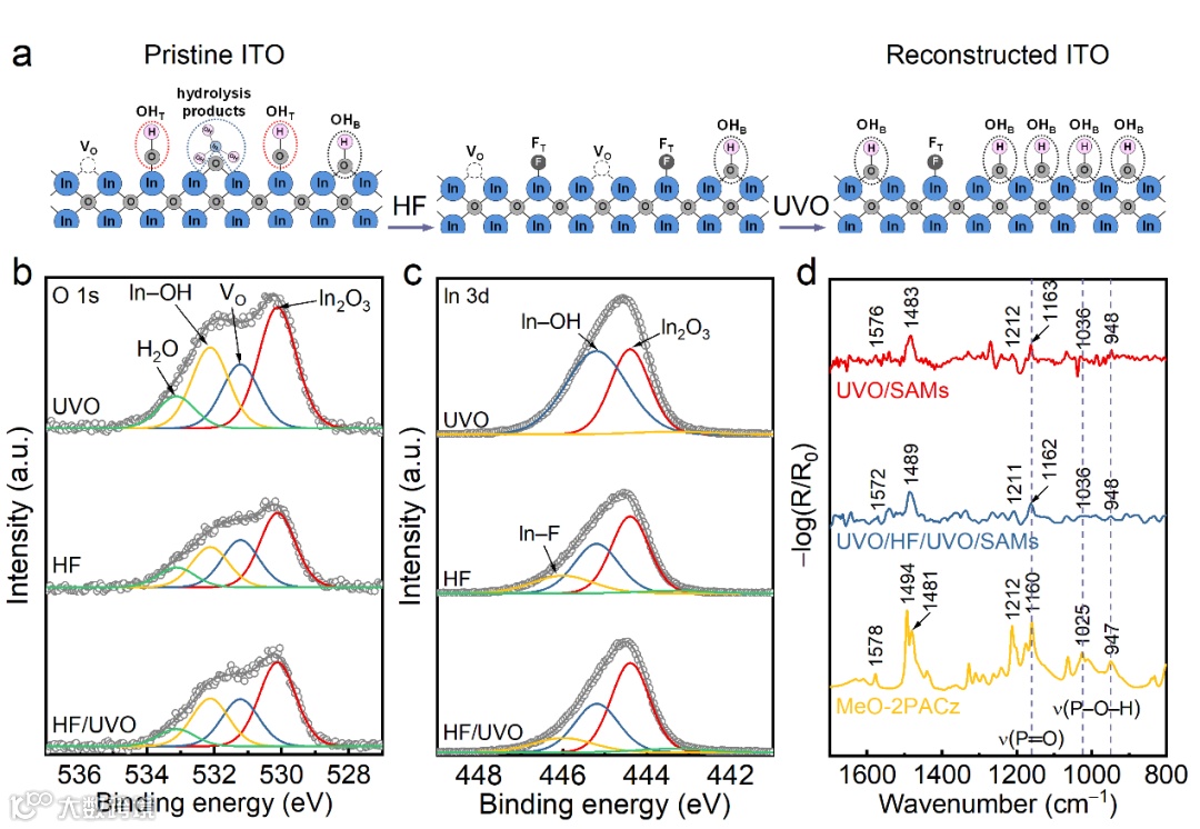 本文通过氢氟酸(HF)和后续的紫外臭氧(UVO)处理对商用的ITO表面进行重构处理。具体而言,首先用调配好的氢氟酸水溶液对ITO表面进行刻蚀,基于典型的酸碱反应,将ITO表面无需的端接羟基(OHT)进行化学移除,并物理去除由紫外臭氧处理产生的水解产物(Hydrolysis products),从而获得富桥接羟基(OHB)和氧空位(VOs)的ITO表面;接着进行UVO处理,获得更多有利于SAM吸附的OHB官能团和少许氟端基,这有利于减少钙钛矿与ITO表面的直接接触。为了验证上述论述,本文进行了75°偏角的XPS和FTIR表征。结果发现,经氢氟酸和紫外臭氧处理后的ITO表面含有更多的桥接羟基和少许氟端基。表面化学的改变更有利于SAM的高密度吸附,这得到了FTIR和AFM-IR(附件)的验证。