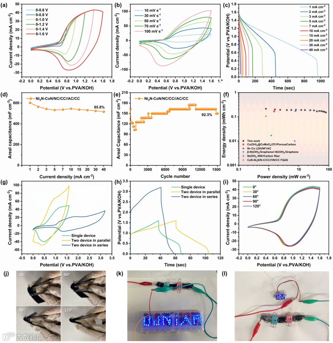 图 6. Ni3N-CoN/NC/CC//AC/CC ASC的电化学性能。(a)扫描速率为30 mV s-1时不同电位窗口的CV曲线。(b)10mV s-1至 100mV s-1不同扫描速率下的CV曲线。(c)1mA cm-2至 40mA cm-2不同电流密度下的GCD曲线。(d)不同电流密度下的面积容量。(e)电流密度为50 mA cm-2时的循环稳定性。(f)与其他器件相比的Ragone图。(g)两个串联和并联ASCs器件的CV和GCD曲线。(i)ASC器件在各种弯曲状态下的CV曲线和(j)相应的数码照片。(k,l)由三个串联ASCs器件供电的商用彩色LED灯和数字显示器的照片图。