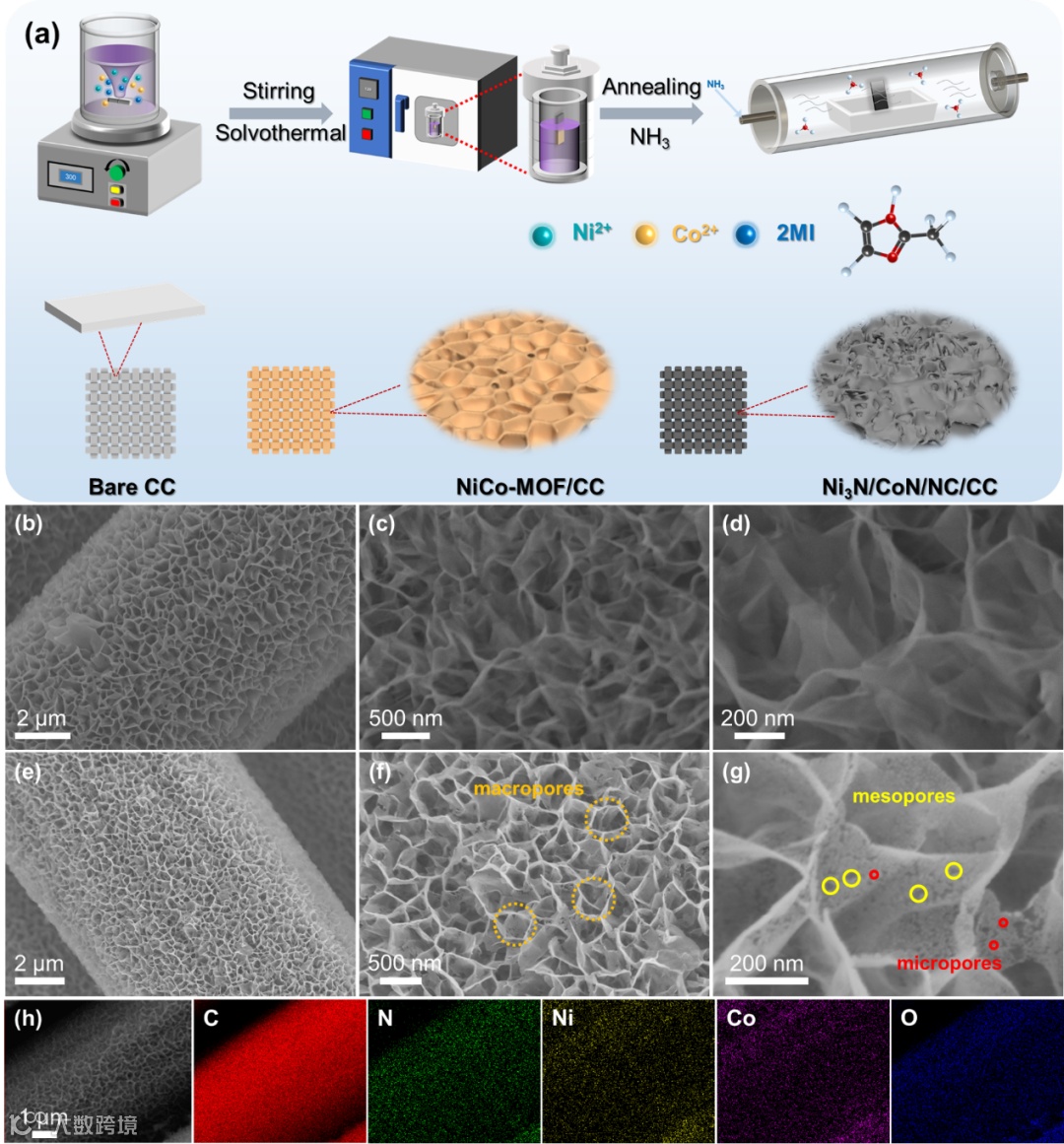 图1.(a)Ni3N-CoN/NC/CC电极的制备过程。不同放大倍数下(b-d)NiCo-MOF/CC和(e-g)Ni3N-CoN/NC/CC 的扫描电镜图像。(h)Ni3N-CoN/NC/CC 的扫描电镜和EDS图。