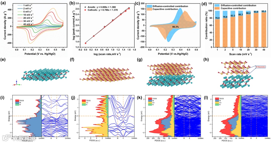 图 5.(a)Ni3N-CoN/NC/CC电极在不同扫描速率下的CV曲线。(b)log(i)与log(v)的关系图。(c)扫描速率为10 mV s-1时Ni3N-CoN/NC/CC电极的扩散控制电流和电容控制电流的分离。(d)不同扫描速率下扩散和电容控制电荷存储的相对贡献。(e)Ni3N、(f)CoN、(g)Ni3N/CoN异质结的正视图,以及(h)异质结中存在两个空位(Ni3N/CoN/N-vacancies)的示意图。(i-l)描述了Ni3N和CoN结构以及Ni3N/CoN和Ni3N/CoN/N-vacancies的能带结构。这些结构的相应状态密度(DOS)(左侧 DOS,右侧带状结构)。Co、Ni和N原子用黄色、绿色和红色球体表示,空位用蓝色虚线表示。