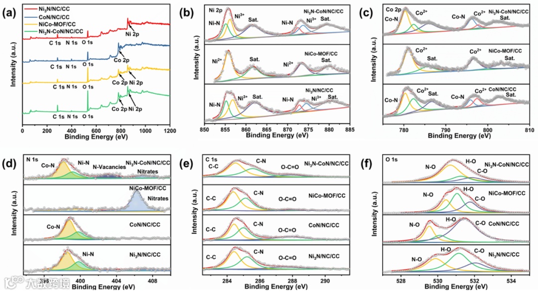 图3.制备的Ni3N/NC/CC、CoN/NC/CC、NiCo-MOF/CC和Ni3N-CoN/NC/CC的XPS光谱。(a)不同电极的XPS全谱。(b)Ni 2p、(c)Co 2p、(d)N 1s、(e)C 1s和(f)O 1s的高分辨率XPS光谱。