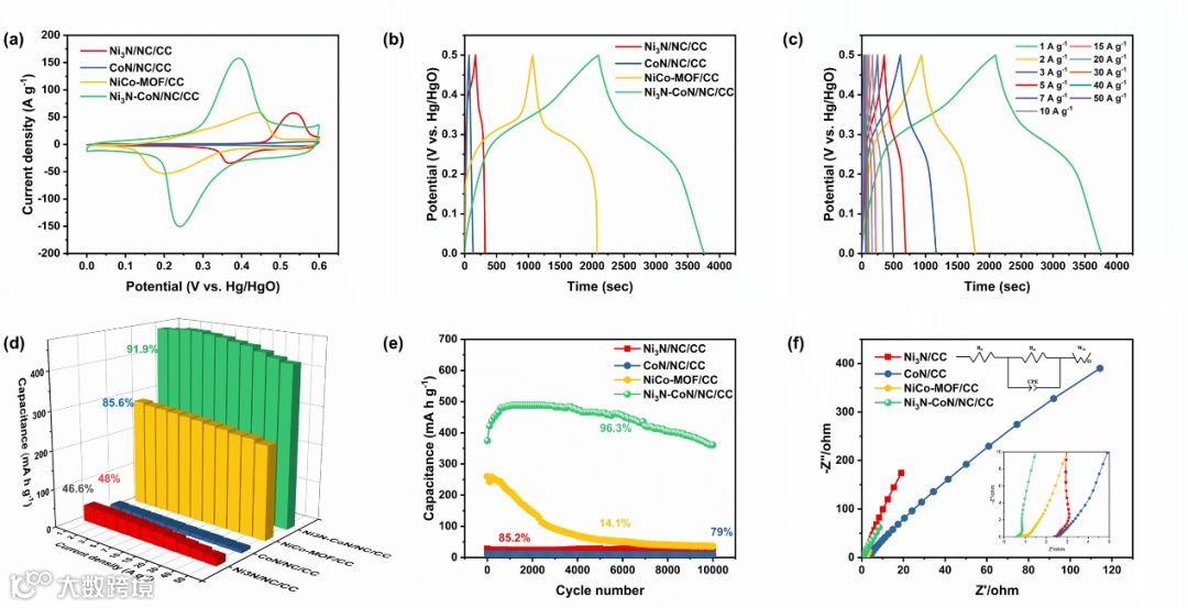 图4.(a)柔性电极在10 mV s-1时的CV曲线和(b)1 A g-1时的GCD曲线。(c)Ni3N-CoN/NC/CC 电极在不同电流密度下的GCD曲线。(d)柔性电极的倍率性能。(e)Ni3N/NC/CC、CoN/NC/CC、NiCo-MOF/CC电极在15 A g-1下的循环性能,以及Ni3N-CoN/NC/CC电极在50 A g-1下的循环稳定性。(f)柔性电极的EIS阻抗谱。