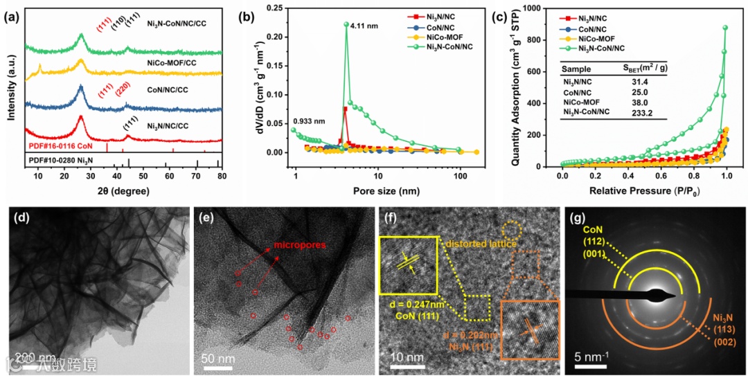 图2.(a)柔性电极的XRD图谱。(b)N2吸附-解吸等温线和(c)Ni3N/NC、CoN/NC、NiCo-MOF和Ni3N-CoN/NC的孔径分布。(d,e)Ni3N-CoN/NC纳米片的TEM、(f)HRTEM和(g)SAED图谱。