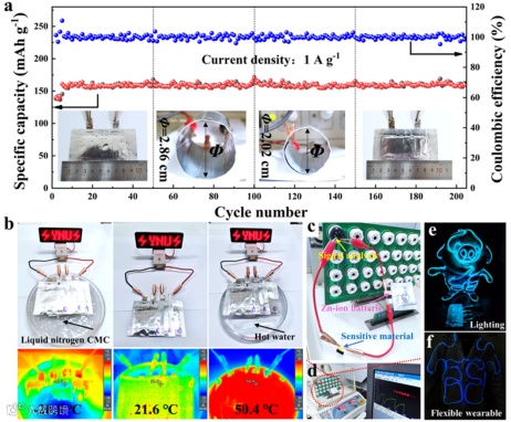 图6. KBVO柔性电池的弯折测试及其实际应用评估。(a)不同弯曲角度下柔性电池的稳定性测试;(b)柔性电池的温度耐受能力;(c-d) 软包电池在柔性电子器件中的应用测试;(e-f)串联的柔性电池驱动电致发光灯带。