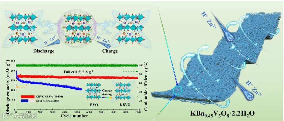 图1. 水系锌离子电池中KBVO正极的储能机理和长循环性能。