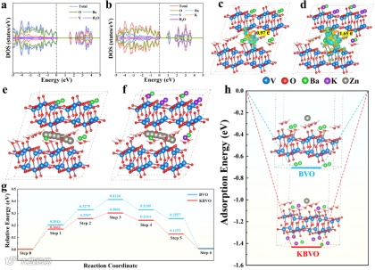 图4. BVO和KBVO的系列DFT计算。(a) BVO和(b) KBVO的DOS图;(c) BVO和(d) KBVO的差分电荷密度图;(e) Zn2+在BVO和(f) KBVO中可能的迁移路径;(g) Zn2+在BVO和KBVO中迁移路径上的扩散势垒;(h)Zn2+在BVO和KBVO上的吸附能。