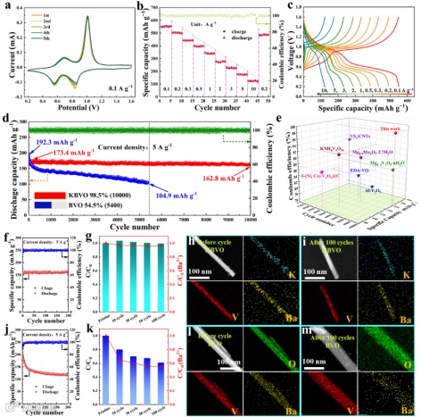 图3. BVO和KBVO的电化学性能测试及容量衰减机制分析。(a) KBVO在0.1 m V s−1下的CV曲线;KBVO的(b)倍率测试和(c) GCD曲线;(d) BVO和KBVO 在5 A g−1下的长循环性能;(e) KBVO与其它正极材料的电化学性能对比;(f-g) KBVO和(j-k) BVO前100次循环中容量保持率与Ba2+含量的关系;(h-i) KBVO和(l-m) BVO循环前后的元素分布图像。