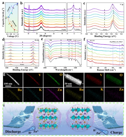 图5. KBVO正极的储能机理及性能提升机制分析。(a)电流密度0.1 A g−1下的充/放电曲线;(b) KBVO的非原位XRD谱;(c) KBVO中V 2p和(d) Zn 2p的非原位XPS谱;(e)KBVO的非原位FTIR谱。(f) KBVO的Raman光谱。(g)放电至0.2 V和(h)充电至1.6 V的元素分布图;(i) KBVO中电荷存储机制示意图。