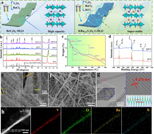 图2. BVO和KBVO的合成及形貌分析。(a) BVO和KBVO制备过程示意图;BVO和KBVO的(b) XRD谱、(c) TG曲线和(d) XPS谱;KBVO的(e-f) SEM图像和(g) TEM图像;(h) KBVO的HAADF-STEM图像和元素分布图。