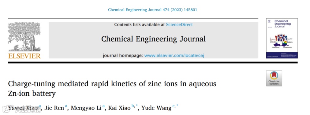 Y. Xiao, J. Ren, M. Li, K. Xiao, Y. Wang, Charge-tuning mediated rapid kinetics of zinc ions in aqueous Zn-ion battery, Chem. Eng. J. 474 (2023) 145801.