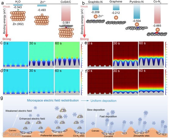 密度泛函理论计算表明CoSA/C添加剂相较于H2O和Zn2+对锌金属表现出较强的亲和力,可以在锌金属沉积过程中优先吸附在锌负极表面。值得注意的是,在沉积过程中吸附在锌金属表面的CoSA/C添加剂在电位反转后可以重新分散到电解液中,从而实现了动态和可持续的调节过程。添加剂中原子分散地Co-N3活性位点具有良好的亲锌性和较强的电荷极化效应,COMSOL模拟结果表明Co-N3活性位点可以重新分配界面处的微空间电场和调节离子通量,从而诱导均匀的锌沉积。