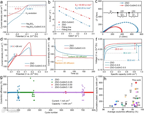 实验测试结果表明痕量CoSA/C添加剂的使用抑制了电解液中的水分解反应和锌金属的腐蚀行为,并且降低了Zn2+去溶剂化的活化能,促进了离子和电子的传输过程。因此,使用CoSA/C添加剂的Zn//Cu非对称电池在800个沉积/剥离循环中表现出99.42%的平均库伦效率,Zn//Zn对称电池在10 mA cm-2的高电流密度下可以稳定循环超过1600 h(累计沉积容量为 8 Ah cm-2),此性能与已有的文献对比也表现出良好的竞争力。结合理论计算和实验验证,原子分散的Co-N3位点表现出良好的亲锌性,有效地促进了形核和沉积动力学。此外,Co-N3位点的电荷极化效应有助于调节Zn-电解质界面的微空间电场,从而促进均匀沉积,所以,CoSA/C添加剂助力了高性能锌金属负极的构建。