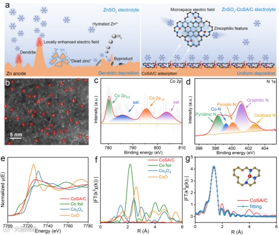 近日,中国海洋大学吴敬一教授、王焕磊教授与美国德州大学奥斯汀分校余桂华教授合作,在国际知名期刊Advanced Materials上发表题为“Atomic Zincophilic Sites Regulating Microspace Electric Fields for Dendrite-Free Zinc Anode”的研究性文章。该研究报道了负载金属钴单原子的碳纳米片(CoSA/C)作为电解液添加剂,用于调节锌-电解液界面的微空间电场,以此构建了高性能的锌金属负极,本项工作为构建高性能水系锌离子电池提供了简单且高效的策略,同时该设计概念在其他金属电池中也具有潜在的应用前景。