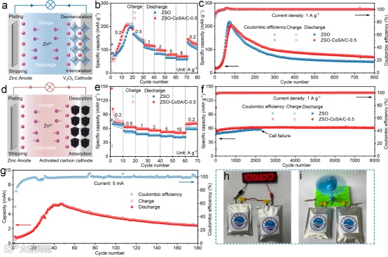 图5 使用含有CoSA/C添加剂电解液组装的Zn//V2O5和Zn//AC器件的电化学性能