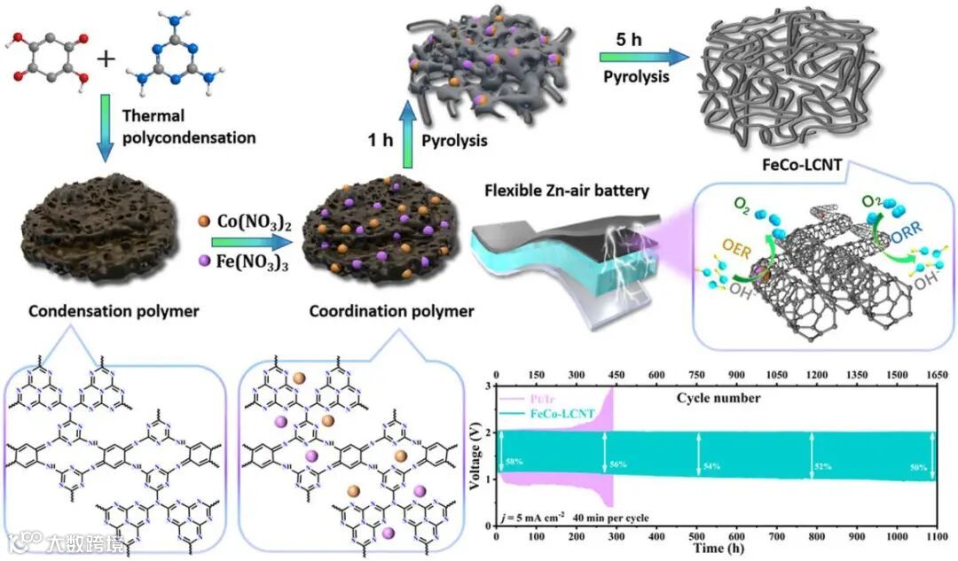 图1. 基于席夫碱聚合物的FeCo/N共掺杂超长碳纳米管的合成方案与高性能锌空气电池应用。