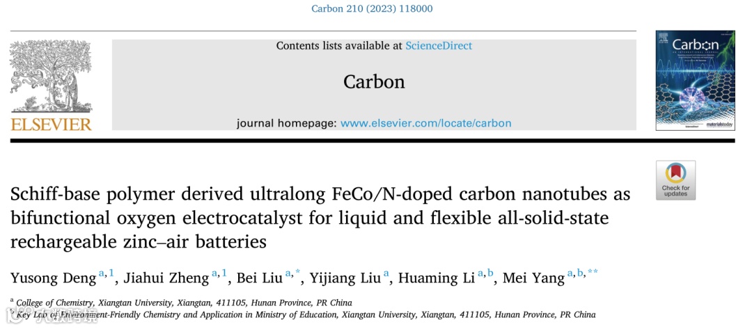 该文章发表在国际知名期刊Carbon上,题为“Schiff-base polymer derived ultralong FeCo/N-doped carbon nanotubes as bifunctional oxygen electrocatalyst for liquid and flexible all-solid-state rechargeable zinc–air batteries”。