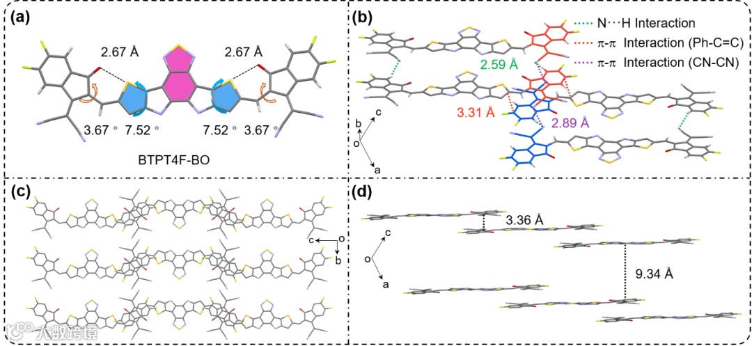 晶体解析对了解受体的分子构象,分子堆积以及分子间的相互作用有至关重要。本工作首次解析了五环受体(BTPT4F-BO)的晶体结构。研究发现,由于S··O非共价构象锁的存在,BTPT4F-BO分子表现出良好的分子平面性。上下层分子通过端基之间的–相互作用(2.89 Å,3.31 Å)进行堆叠,而且前后两个分子中的氰基间存在较强的氢键作用(2.59Å)。此外,吡咯环上的柔性烷基侧链向共轭平面两侧伸展,有效地防止了受体的过度聚集。与七环受体晶体中的三维网状堆积不同,BTPT4F-BO形成独特的二维阶梯状堆积,这能够保证其固态下的电荷传输。