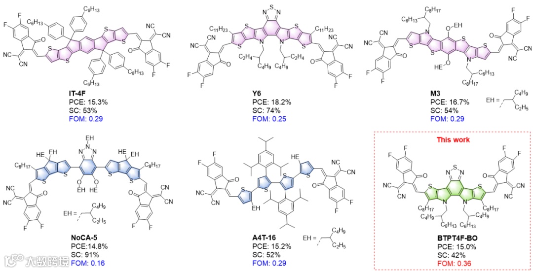图1. 具有代表性的高性能受体和BTPT4F-BO的化学结构、PCE、SCs和FOMs。
