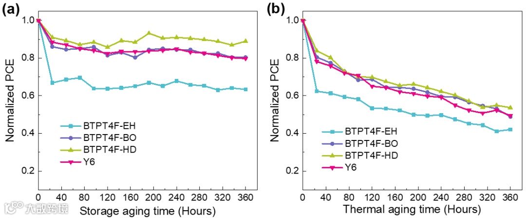 图3. 基于五环受体和七环受体Y6光伏器件的(a)储存稳定性、(b)热稳定性。