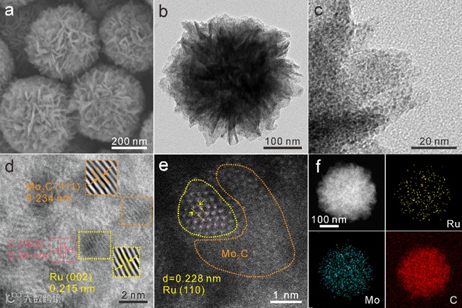 在DFT计算启发下所制备的Mo2C-Ru/C异质结催化剂呈现出花状微球结构,Mo2C纳米颗粒和Ru团簇锚定在碳纳米片。HAADF-STEM测试表明Ru、Mo、和C元素在Mo2C-Ru/C催化剂上均匀分布(图2)。
