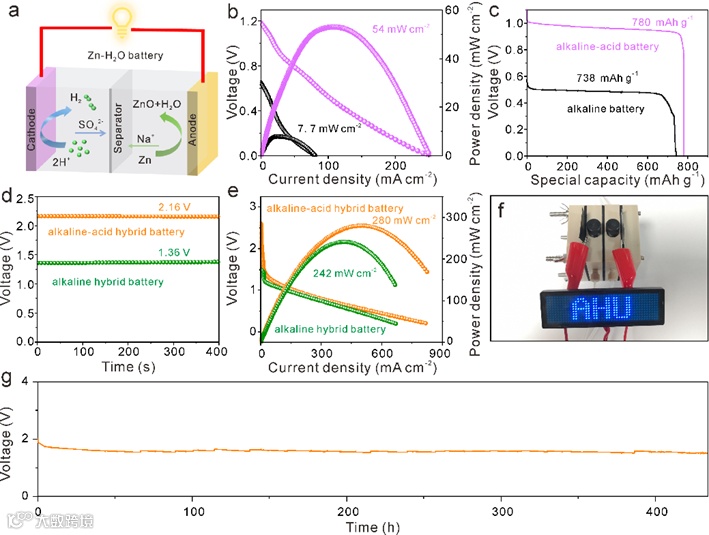分别以Mo2C-Ru/C和Zn箔为阴极和阳极材料组装的碱性-酸性Zn-H2O电池具有较高的放电功率密度(54 mW cm-2)和放电容量(780 mAh g-1)。组装的Zn-H2O/Zn-O2杂化电池具有2.16 V的高开路电压, 峰值放电功率密度达280 mW cm-2,可以点亮一个LED灯。同时,Zn-H2O/Zn-O2杂化电池具有较好的放电稳定性(图6)。