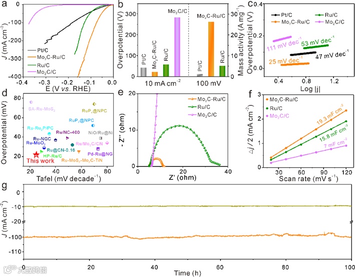 Mo2C-Ru/C的电催化性能明显优于Ru/C和Mo2C/C,甚至优于商用Pt/C。在电流密度为10 mA cm-2时的过电位仅为22 mV,且具有较小的Tafel斜率(25 mV dec-1)。在过电位为100 mV时的质量活性为26.37 A mgRu-1,是商用Pt/C的22.9倍。同时,其电催化活性也优于大多数文献报道的Ru基催化剂。Mo2C-Ru/C与Ru/C和Mo2C/C相比显示了最低的电荷传递电阻,进一步证明了Mo2C-Ru/C具有较好的电荷转移动力学。同时,Mo2C-Ru/C也展现出色的电化学稳定性(图4)。
