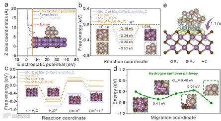 理论计算研究表明,引入具有高功函数的Mo2C载体后可有效调节Ru团簇的局部电子环境,优化H*吸附的吉布斯自由能。Mo2C还可以促进H2O解离,并通过氢溢流增加Ru位点上的H覆盖率,确保Ru团簇在碱性和中性介质中的HER活性得到提升(图1)。