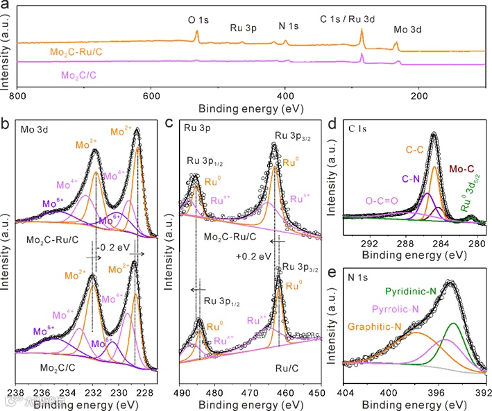 与Mo2C相比,Mo2C-Ru/C的Mo 3d XPS光谱向低能量端偏移。与Ru/C相比,Mo2C-Ru/C的Ru 3p XPS光谱向更高能量端偏移,表明电子从Ru向Mo2C转移。这种现象与DFT计算结论一致(图3)。