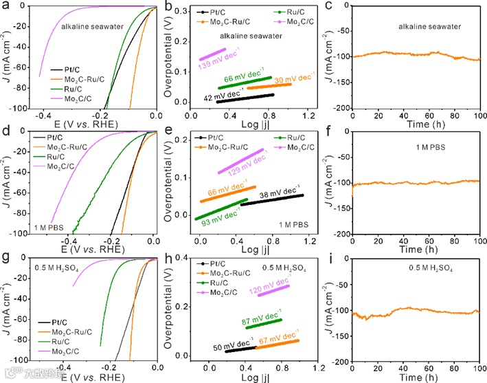 二、 制备的Mo2C-Ru/C催化剂具有优异的广谱pH活性,在碱性电解液、碱性海水、中性和酸性溶液中均具有较好的HER活性和稳定性。