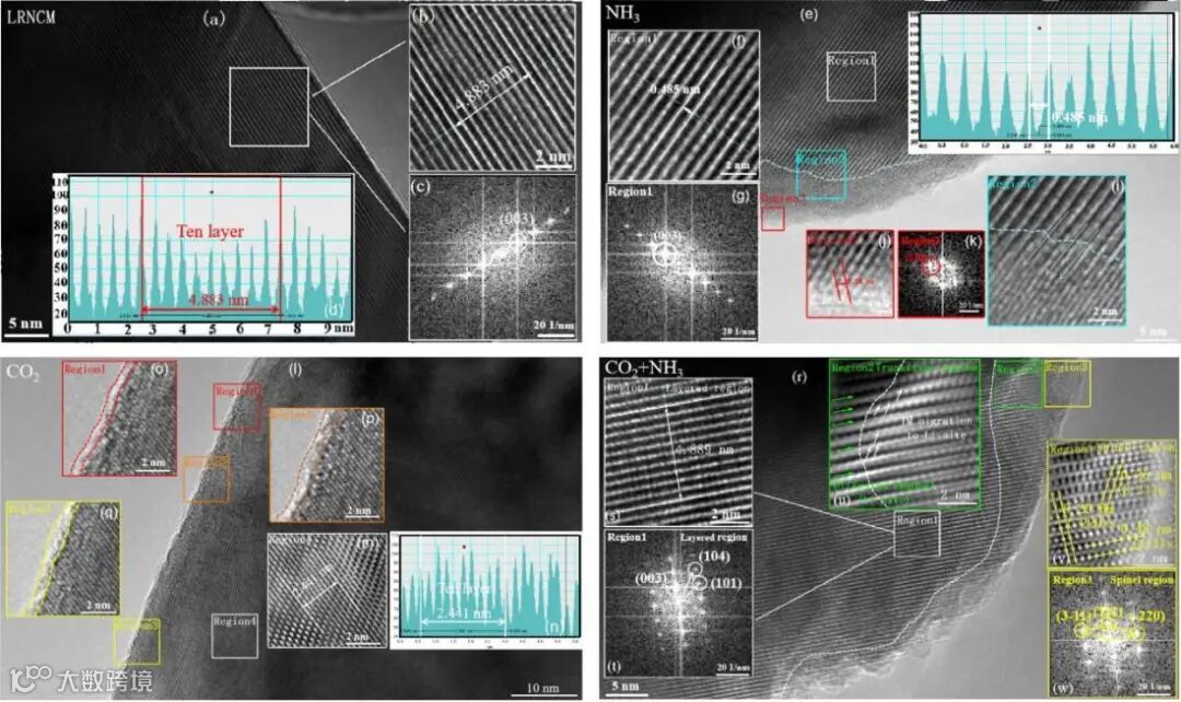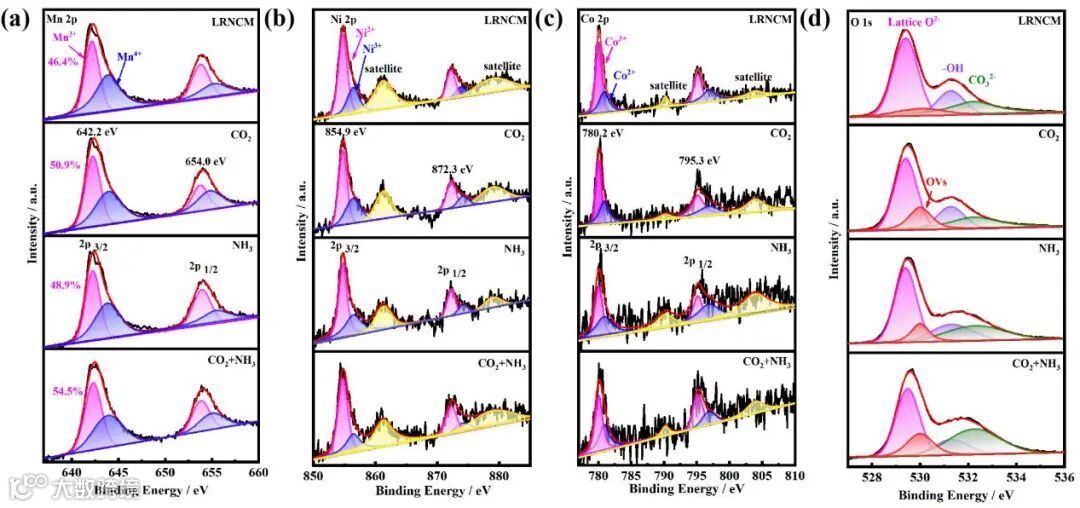 通过TEM对LRNCM、CO2、NH3和CO2+NH3样品进行表征,如图2所示,探究CO2和NH3气体的处理对正极材料的表面结构产生的影响。研究发现CO2和NH3气体处理对正极材料的表面产生了影响。通过TEM图像观察,显示了不同处理下样品的表面纳米结构和形貌。相关的IFFT和FFT显示了样品的晶格纹理和层间距。其中,LRNCM样品展示了明显的晶格纹理(0.48 nm),与LiTMO2相的(003)晶面或Li2MnO3相的(001)晶面相匹配,说明样品具有清晰的分层结构。NH3处理样品显示明显的表面层,其内部体相层呈现完整的层状结构,层间距为0.48 nm,其表面层间距为0.28 nm表面表面具有(220)的尖晶石相晶面。CO2处理后样品表面呈现超薄非晶层,表明CO2分子不断轰击样品表面,在表面与Li2O反应生成Li2CO3。在CO2+NH3双气体处理下,表面结构差异明显的区域呈现出5-10 nm的混合相结构,包括尖晶石相和阳离子无序结构。在CO2+NH3处理样品中,观察到转移金属离子从体相迁移到外表面的Li层,表明处理诱导了近表面微观结构的变化。通过简单的气固处理,实现了表面可混合相结构调控,同时保持了体相和表面修改层的结构完整性。