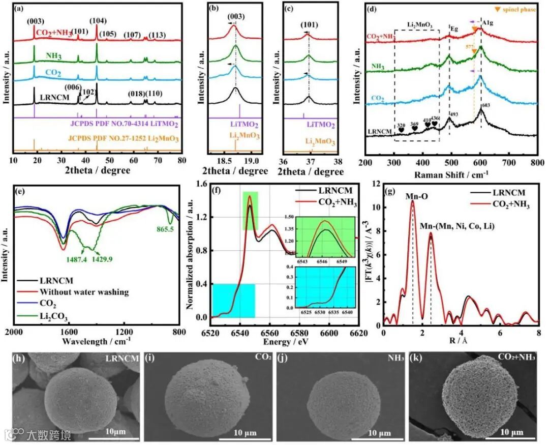XRD显示气固处理前后,整体衍射峰变化很小,如图1所示。放大的XRD图表明,CO2和CO2+NH3样品的(003)/(101)衍射峰相对于其他样品发生了向较低角度移动,表明Li+层的面间距增大。这种增大的锂层间距将有利于Li+离子的扩散,可能归因于气固处理过程中Li和O的缺失引起的结构缺陷。Raman图显示Li2MnO3的强度的减小可能是由于低温气固热处理过程中Li2MnO3相的部分激活导致的,进而削弱了键的振动模式。此外,文中还使用FTIR和XPS对CO2样品进行了分析,结果显示在未经水洗的CO2样品中可以检测到更多的Li2CO3,表明CO2气体通过在富锂阴极材料表面提取氧化锂(Li2O)促成了Li2CO3的形成。经过水洗的CO2样品可以有效地去除附着在表面上的Li2CO3,从而产生大量的Li/O空位,导致局部结构缺陷并实现材料Li2MnO3的预激活过程。针对LRNCM和CO2+NH3样品进行的Mn K边 XANES和EXAFS光谱分析结果。实验结果表明,在CO2+NH3改性后,LRNCM样品的体相结构未受到影响,说明气固处理对富锂材料的整体结构没有损伤。在Mn K边的EXAFS光谱中,可以观察到两个明显的峰,分别对应于Mn吸收原子的氧和金属邻近原子。在经过气固处理后,Mn-O键的强度没有明显变化,但是Mn-(Mn, Ni, Co, Li)键的强度增强,暗示了六方相的转变和TM层中Li+离子的移除。