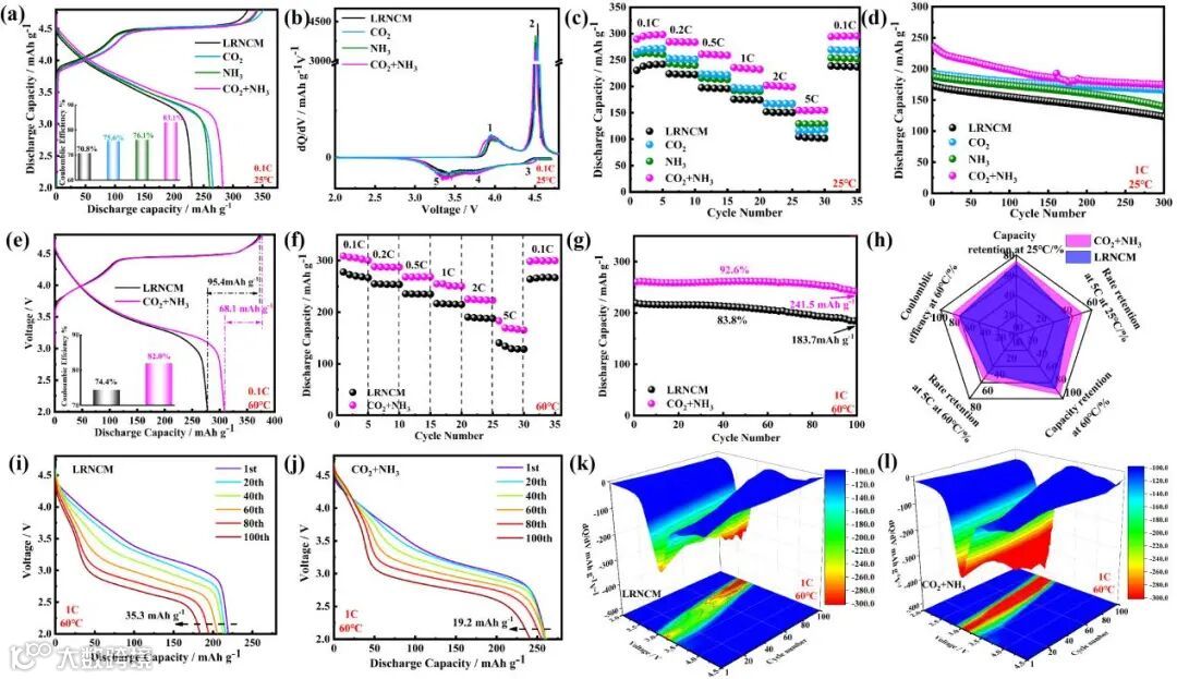 该研究通过气体处理技术改善了锂离子电池的电化学性能,如图4。LRNCM、CO2、NH3和CO2+NH3样品的首次不可逆容量分别为95.0、82.1、81.7和57.3 mAh g-1,相应的库伦效率为70.8、75.6、76.1和83.1%。由于表面混溶结构和预活化反应的作用,CO2+NH3样品显示出最高的充放电比容量、最低的不可逆容量损失和最好的初始嵌入比容量,表明其锂离子扩散动力学相对畅通,少量晶格氧释放。CO2+NH3样品在不同倍率下的放电容量分别为289.2、284.3、260.8、235.6、202.0和154.5 mAh g-1,而LRNCM样品的对应容量仅为230.3、223.9、197.4、175.6、151.8和104.8 mAh g-1。CO2+NH3样品具有出色的倍率性能,这归功于构建了具有三维锂离子扩散通道和氧空位的尖晶石相。LRNCM样品在1C 300次循环后提供了123.3 mAh g-1的放电容量,并保持71.0%的容量保持率。而CO2、NH3和CO2+NH3样品的放电容量分别为166.2、139.4和178.4 mAh g-1,伴随着86.0、73.8和73.9%的容量保持率。在60℃下CO2+NH3样品表现出309.1 mAh g-1的超高放电容量,而LRNCM样品只有277.8 mAh g-1。LRNCM和CO2+NH3样品的不可逆容量分别为95.4和68.1 mAh g-1,相应的初始嵌入比容量分别为74.4和82.0%,表明CO2+NH3样品中阴离子氧化反应具有较高的可逆性。此外,CO2+NH3样品在图4f中显示出比LRNCM样品更优秀的倍率性能。即使在高电流密度为5 C的条件下,CO2+NH3样品仍然可以平均提供170.5 mAh g-1的高容量,而LRNCM样品仅为132.1 mAh g-1(平均值)。在1C,60℃下循环100次,CO2+NH3样品在仍具有优异的放电容量(241.5 mAh g-1)和容量保持率(92.6%),而LRNCM样品的对应值为183.7 mAh g-1(83.8%的容量保持率)。CO2+NH3样品在高温下展现出优秀的循环性能,主要得益于具有富含氧空位的外延混溶结构的保护层,可以避免电极和电解液之间的严重副反应。因此,气体处理样品改善的电化学性能与具有富含氧空位的混合相表面层紧密相关。气体固体处理过程中形成的氧空位对减少不可逆氧损失、降低电极极化以及促进锂离子扩散具有益处。同时,具有尖晶石相和阳离子无序相具有耐高电压、避免界面副反应、减少Mn2+溶解、促进快速锂离子扩散等优势。