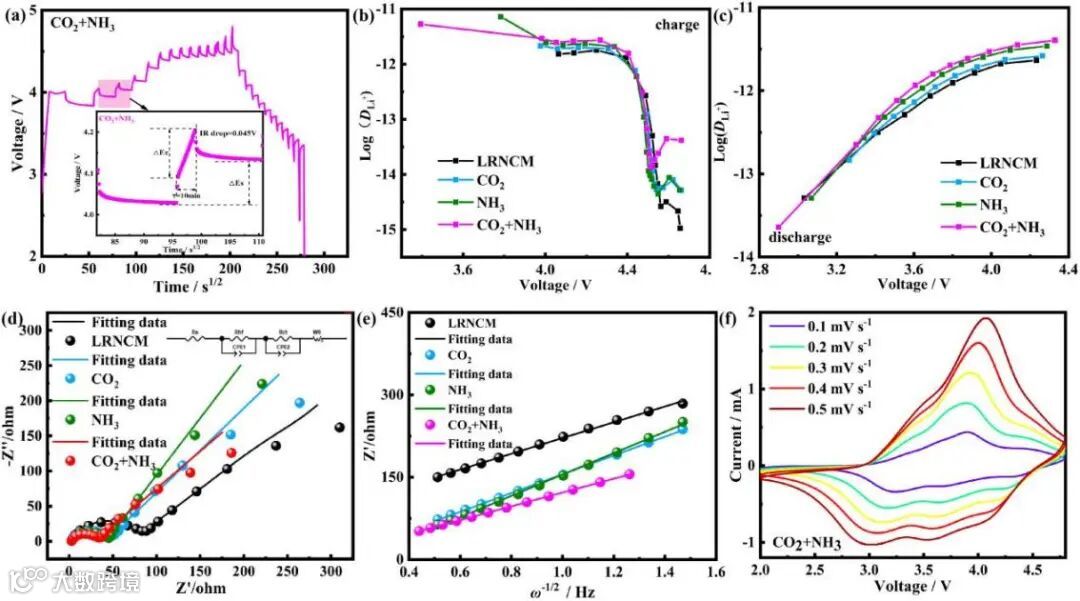 图5展示了对LRNCM、CO2、NH3和CO2+NH3样品进行的GITT、EIS和CV实验的结果。GITT曲线显示,在充放电过程中,CO2+NH3样品具有较高的Li+离子扩散系数和DLi+值。EIS测试结果显示,经过气体处理的样品的电荷转移壁垒较低,表明气体处理样品具有更好的电荷传递性能。低频区域的Z'-ω-1/2曲线也验证了气体处理样品具有更好的Li+扩散系数。CV曲线表明CO2+NH3样品具有更高的容量和更快的动力学响应速度,甚至在高扫描速率下仍能保持良好的还原峰。综上所述,气体处理样品中尖晶石相的存在显著提高了Li+离子扩散速率和动力学性能。