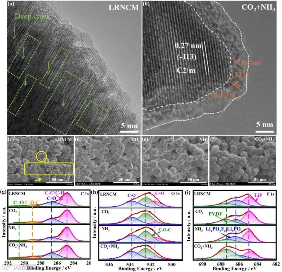 使用XPS和EPR分析,如图3所示,研究气体处理对LRNCM表面过渡金属离子和氧结构的影响。实验结果显示,经过气体处理后,所有样品中的Mn元素具有两个价态,且气体处理后Mn3+峰的相对值逐渐增加,表明气体处理后Mn离子发生了还原。O 1s谱线显示了晶格氧和表面吸附氧的特征峰位,同时出现了与氧空位相关的额外峰位。与LRNCM相比,在CO2、NH3和CO2+NH3处理后的样品中可以找到更多的氧空位,表明在气体处理后表面形成了更多的氧空位。EPR测试结果进一步证实了带有未成对电子的氧空位的存在,且CO2+NH3处理后样品中氧空位更为丰富。这些研究结果说明了气体处理能够改变LRNCM表面的化学状态,形成富含氧空位的表面可混合结构。该处理策略通过稳定表面氧结构、抑制过渡金属溶解和缓解界面副反应,实现了均匀而富集的氧空位混合相表面层,包含尖晶石相和阳离子无序相。