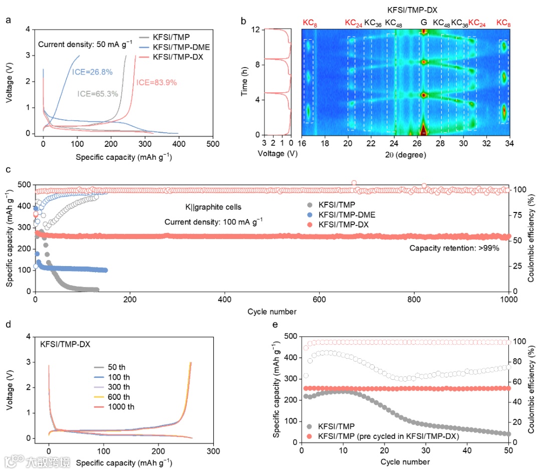 基于上述电解液的溶剂化结构的优化,当使用KFSI/TMP-DME电解液时,石墨阳极具有一个较高的放电平台,表明发生了K+-溶剂共嵌入行为,这主要是由于K+-DME之间强相互作用导致的。此外,当使用KFSI/TMP电解液时,石墨阳极的初始库伦效率只有63.5%。而石墨阳极在KFSI/TMP-DX电解液中,首圈循环库伦效率高达83.9%,且在100 mA g-1的电流密度下表现出超稳定的循环性能,在经过1000次循环后容量保持率大于99%。此外,设计了实验对SEI的稳定性进行验证。使用石墨阳极在KFSI/TMP-DX电解液中预循环在其表面构建SEI,之后转移至KFSI/TMP电解液中进行电化学循环测试。结果表明,预循环后的石墨阳极在KFSI/TMP电解液中循环50圈容量几乎不衰减,且库伦效率大于99%。这些结果表明,随着DX反溶剂的引入,KFSI/TMP−DX电解液可以在石墨阳极表面形成稳定的SEI层,表现出优异的相容性。