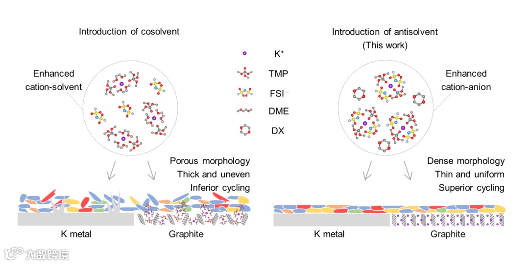 图1. 在磷酸盐基电解液中引入DME共溶剂或DX反溶剂后,对电解液溶剂化结构和界面结构的影响示意图。