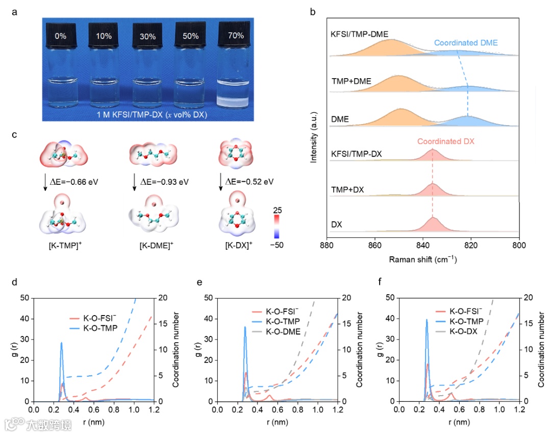 该工作中,选择了环状醚(DX)作为反溶剂和与DX分子式相似的链状醚(DME)作为共溶剂进行对比。作者通过实验验证了DX溶剂具有反溶剂的特性,以及通过Raman表征和密度泛函理论计算表明K+与DX溶剂之间的配位较弱。同时,Raman表征和径向分布函数也表明,随着在磷酸盐基电解液中引入DX反溶剂,K+-阴离子之间的配位能力会进一步加强,这将有利于形成富阴离子衍生的界面层。