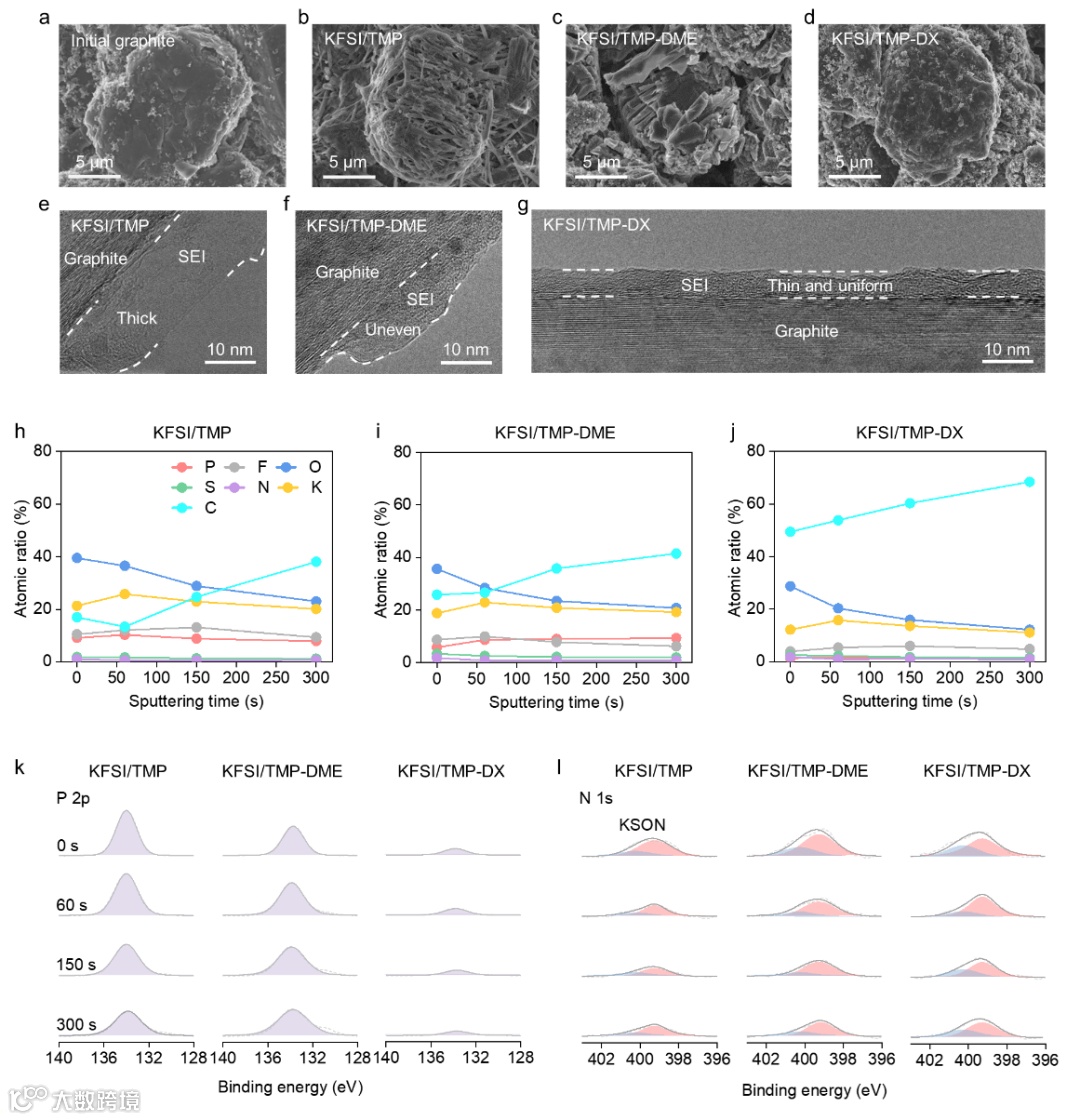 作者通过SEM和TEM对循环后的石墨阳极进行表征。结果表明,石墨阳极在KFSI/TMP-DX电解液中循环可以有效保持石墨的初始结构,且在石墨阳极表面形成了薄而均匀的SEI层,这是石墨阳极长期稳定循环的保证。此外,对XPS结果分析表明,在磷酸盐基电解液中引入DX反溶剂,可以在石墨阳极表面构建超稳定的SEI层,这可以抑制溶剂的持续分解,有利于实现石墨阳极的长期稳定循环。