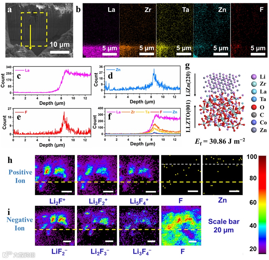 图2. (a) LZnF与LLZTO的截面FIB-SEM图像。(b-f) 界面元素分布。(g) LiZn和LLZTO的原子结构,以及二者之间的Ef。(h, i) LZnF/LLZTO界面TOF-SIMS正/负离子图。