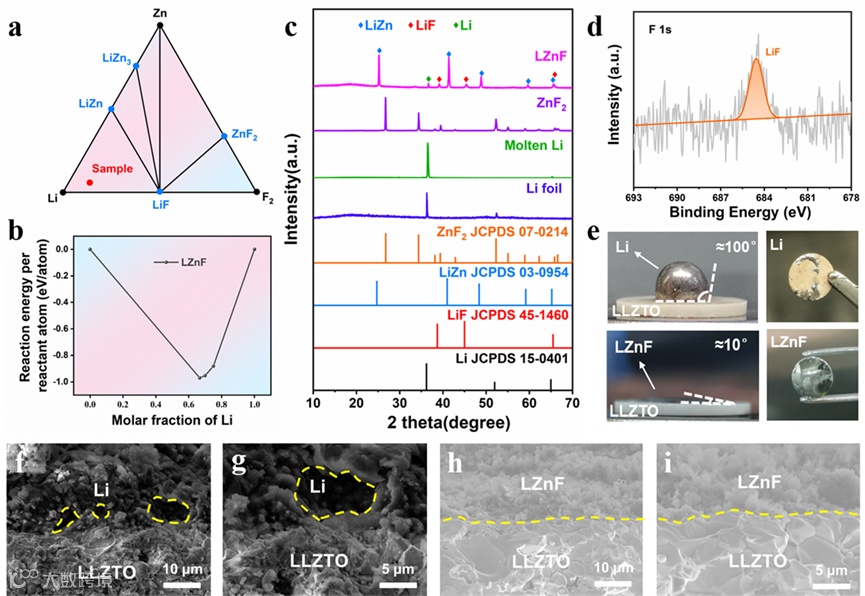 体系的三元相图。(b) Li和ZnF2之间的反应能。(c) Li箔、熔融Li、ZnF2粉末和LZnF的XRD。(d) LZnF的F 1s精细谱。(e) 纯Li和LZnF对LLZTO的界面润湿性和接触角的数码照片。(f-i) Li和LZnF与LLZTO的截面SEM图像。